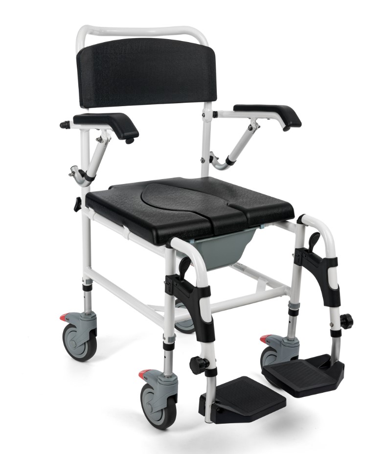 Der MASTER-TIM 3-in-1 Transport-Dusch- und Toilettenrollstuhl ist ein Hilfsmittel für Menschen, die Schwierigkeiten haben, sich selbstständig fortzubewegen und für Menschen mit Funktionsstörungen und Mobilitätseinschränkungen. Er ist für den Gebrauch in Innenräumen konzipiert. Er kann nur mit Hilfe einer Begleitperson bedient werden. Der Rollstuhl verfügt über eine Dusch-, Transport- und Toilettenfunktion dank eines Sanitärcontainers unter dem Sitz und vier schwenkbaren Rädern. Er ist so konzipiert, dass er die Hygiene und die physiologischen Aktivitäten des Benutzers erleichtert. Besonders empfohlen für Menschen mit Mobilitätsproblemen aufgrund von: Lähmungen, Übergewicht, degenerative oder deformierte Gliedmaßen, degenerative oder beschädigte Gelenke, Gliedmaßenschäden oder Amputationen, Herz-Kreislauf-Erkrankungen, Durchblutungsstörungen.