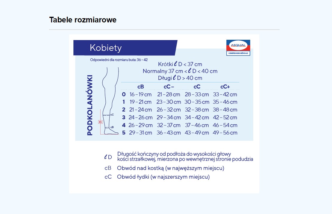Das Produkt ist in zwei ASQUAL Kompressionsklassen erhältlich. Die erste, die als zweite gekennzeichnet ist, wird zur Prophylaxe verwendet. Sie sollten von Personen verwendet werden, bei denen das Risiko einer Veneninsuffizienz der unteren Gliedmaßen besteht. Kniestrümpfe, die der dritten Kompressionsklasse entsprechen – 20-36 mm Hg – sind für Menschen mit einer bereits entwickelten Venenerkrankung bestimmt. Vor dem Kauf von Kniestrümpfen ist es ratsam, Ihren Arzt zu konsultieren.