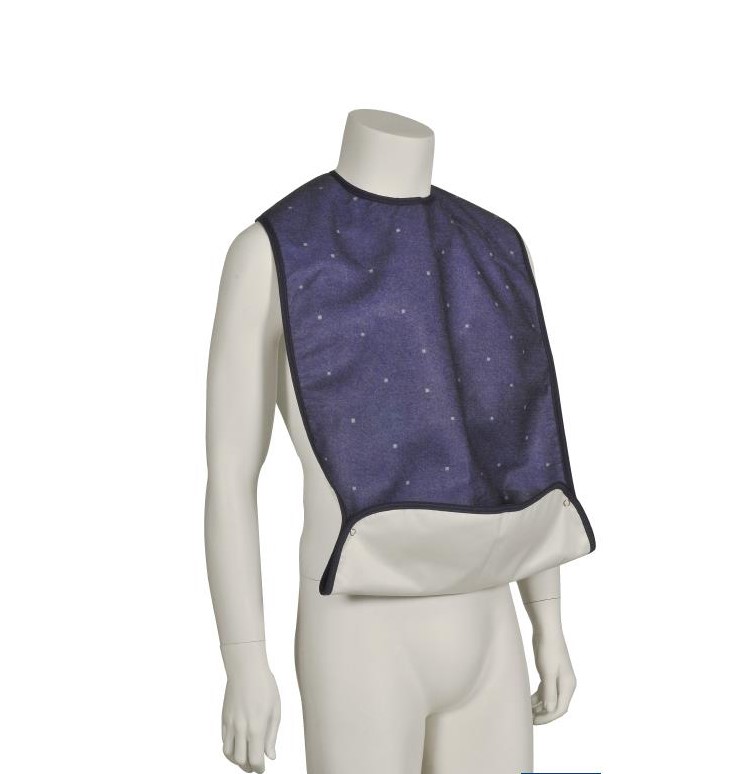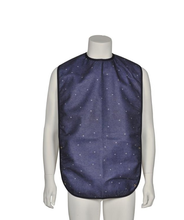 Wiederverwendbares Lätzchen für Erwachsene, mit verstellbarer Tasche. Die saugfähige Oberfläche und die wasserdichte untere Schicht schützen die Kleidung vor Schmutz und Nässe. Der Zwei-Knopf-Verschluss im Nacken ermöglicht die richtige Einstellung.